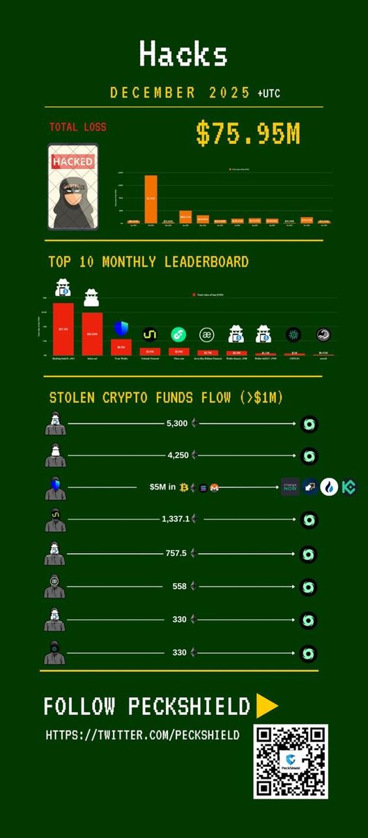 🏳️🌈 По данным PeckShield, потери от криптовзломов в декабре снизились на 60% — до $76 млн по сравнению с $194,2 млн в ноябре.