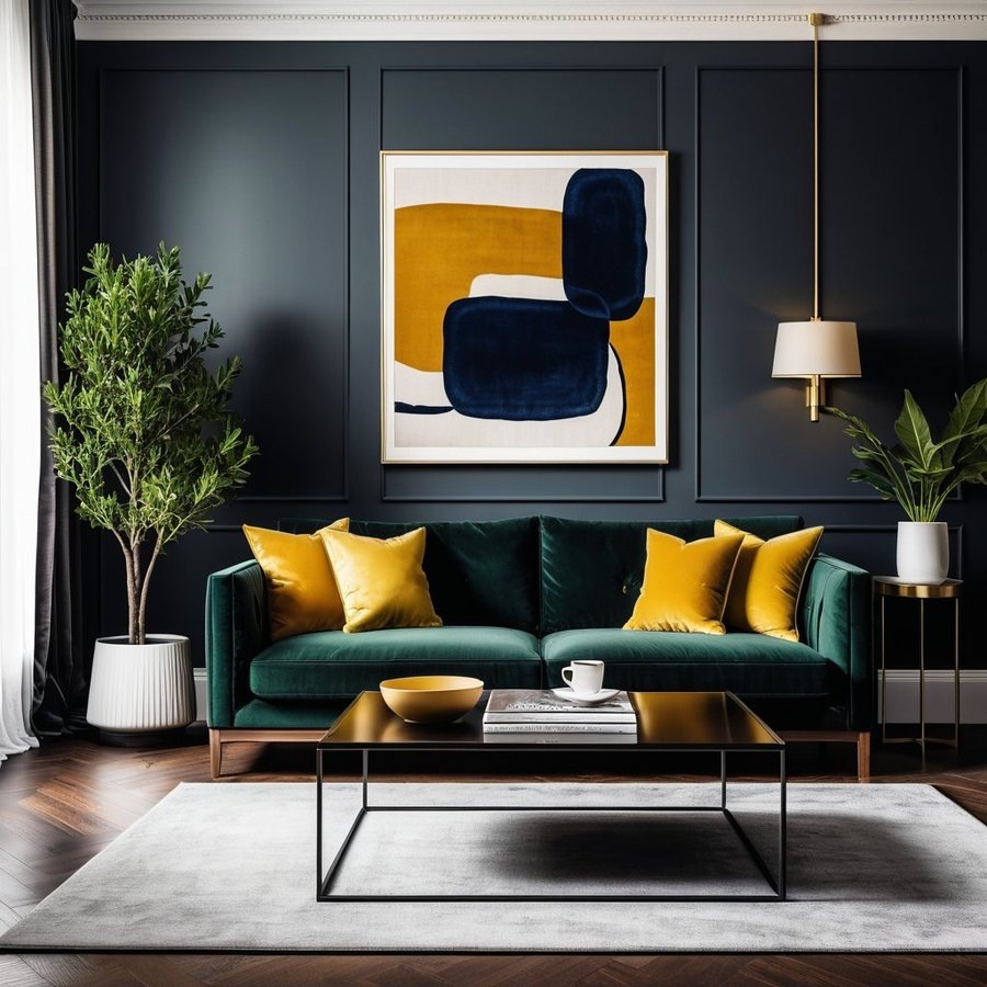 Темные оттенки, такие как угольный черный, глубокий синий или изумрудный, создают атмосферу уюта и элегантности. Однако, чтобы избежать ощущения замкнутости, их стоит разбавить яркими акцентами - например, золотыми или медными элементами, насыщенными красными или яркими желтыми тонами. Эти акценты могут проявляться в текстиле, декоре или мебели, добавляя динамику и подчеркивая индивидуальность пространства.