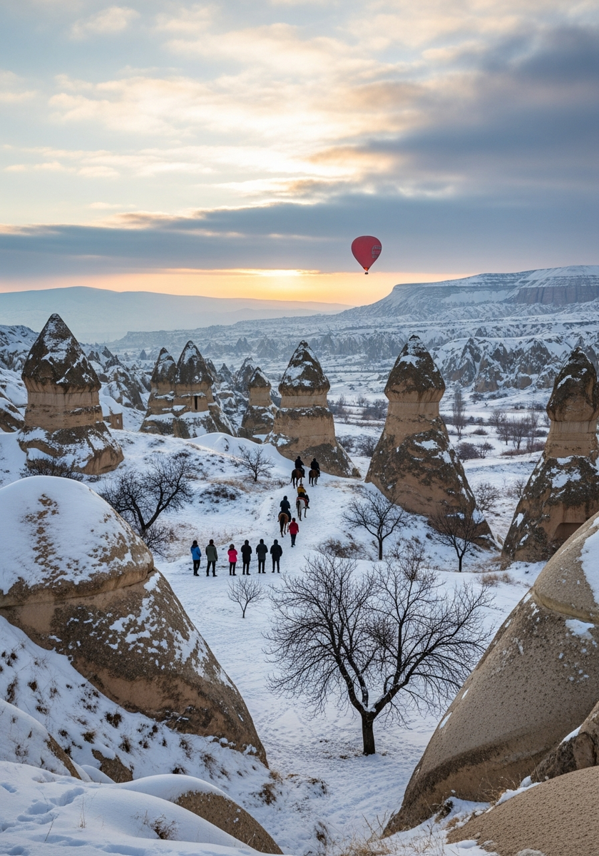 Воздушные шары над заснеженной Каппадокией — визитная карточка региона и главная причина, по которой сюда едут путешественники со всего мира. Зимой это зрелище становится особенно волшебным благодаря снежному покрову на причудливых скалах.