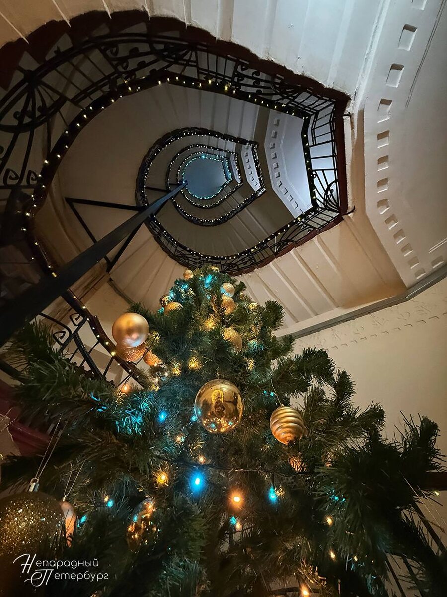 Праздничный декор подчеркивает историческую эстетику парадной – там можно увидеть восстановленные двери, украшения фигурками сов, барельефы в виде шишек и изящную винтовую лестницу с коваными перилами.