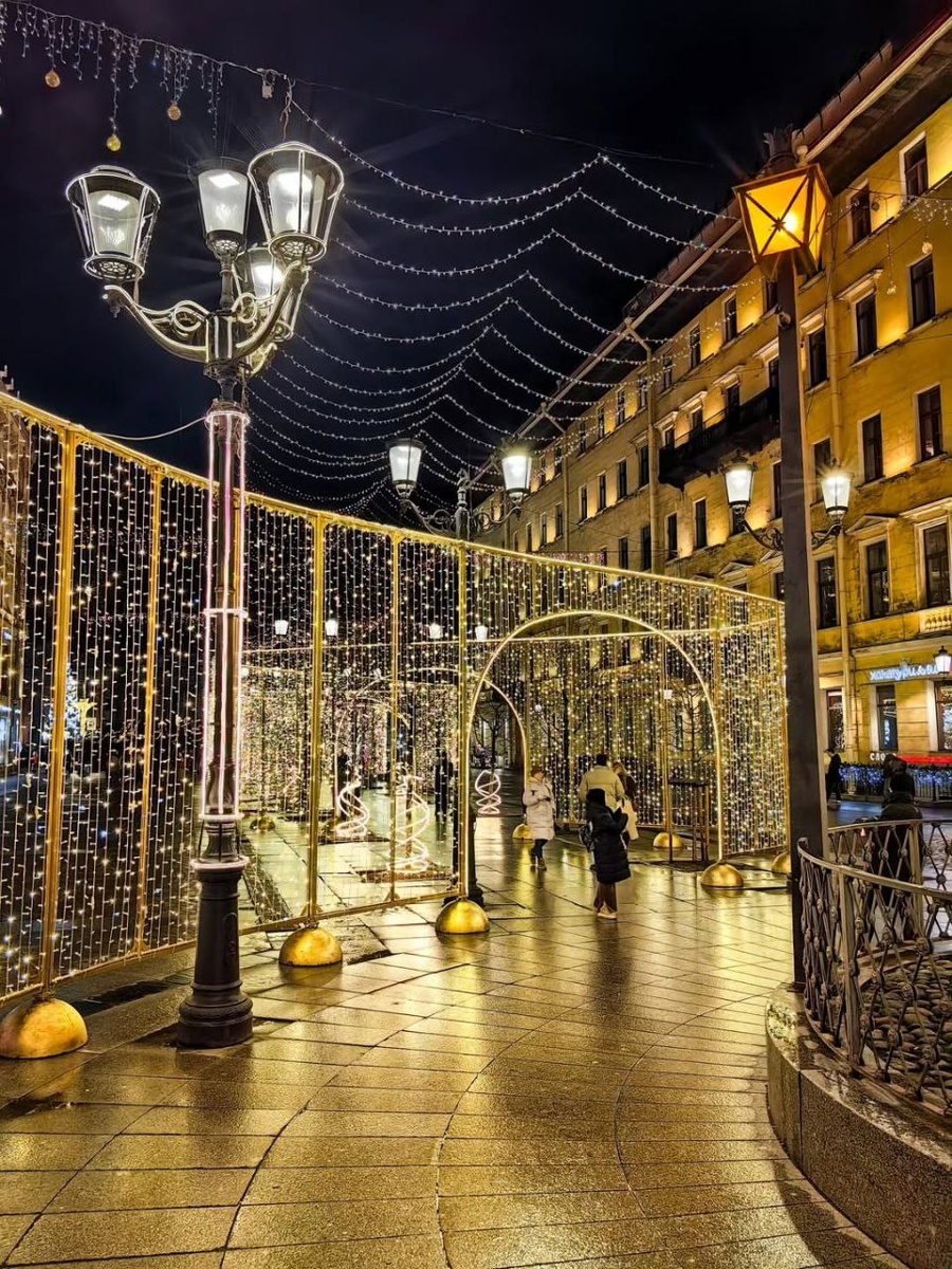 Перед праздниками на уютной улице развернули светящуюся «ленту»: конструкция тянется от Невского проспекта до конца улицы, образуя 350-метровый мерцающий коридор. 📸Отличная фотозона для новогодних снимков! 👤 Питер в голове! 🔵 Теперь в МАХ
