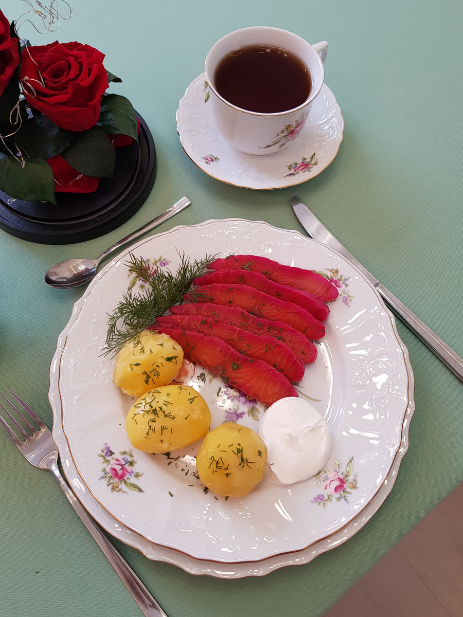 Добрый день, дорогие друзья! Сегодня я представляю вашему вниманию очень яркую закуску скандинавской кухни, которая украсит любой праздничный стол, а также может выступить как основное блюдо для ужина, дополненное отварным картофелем. Для приготовления 23 порций нам понадобятся: 3 килограмма сёмги (вес самого филе составит 2,3 килограмма), 500 грамм свеклы, 350 грамм лимона, 400 грамм клюквы, 200 грамм джина, 5 грамм можжевельника, 18 грамм сушеного хрена, 3 столовые ложки соли, 3 столовые ложки сахара, 1 чайная ложка черного молотого перца. Для оформления 23 порций нам понадобятся: картофель 2 килограмма, масло сливочное 50 грамм, сметана 200 грамм, укроп 50 грамм. Приготовление: срезать кожу и кости с филе рыбы. С помощью кухонного пинцета удалить перпендикулярные кости. Положить ягоды можжевельника в ступку. Измельчить ягоды можжевельника. В ёмкость высыпать соль, сахар, чёрный перец и ягоды можжевельника. Перемешать. Обсыпать филе сёмги со всех сторон смесью приправ, соли и са