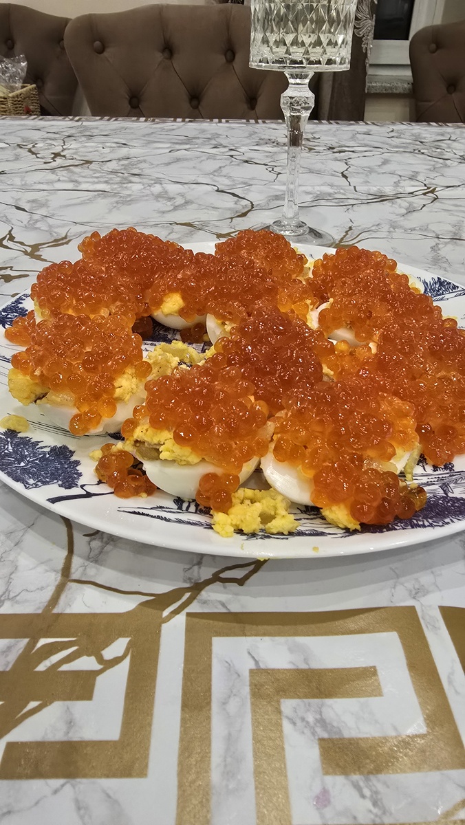 Самая Новогодняя закуса этого года "Красной лошади".Красные Новогодние яйца Фаберже. Многие любят фаршированные яйца, эти самые вкусные и эффектные. Все наверно, знают, что яичный желток и лук усливает вкус икры, именно в таком сочетании икра подается в бизнес классе с луком и желтком , это премиальный вариант подачи икры.