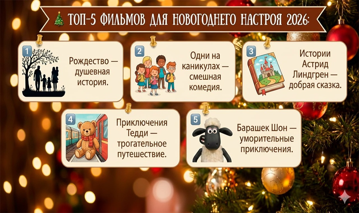 : 1️⃣ Рождество — душевная история. 2️⃣ Одни на каникулах — смешная комедия. 3️⃣ Истории Астрид Линдгрен — добрая сказка. 4️⃣ Приключения Тедди — трогательное путешествие. 5️⃣ Барашек Шон — уморительные приключения. Создайте своё волшебство! ✨ #новыйгод2026 #фильмы