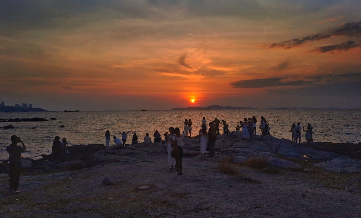 В основном они просто сидят и смотрят на море в свете заката, болтают и фотографируют.