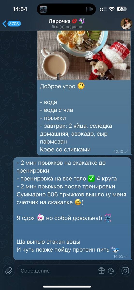 Сегодня неделя как я занимаюсь и ем под наблюдением тренера У меня много было попыток личных и групповых онлайн ведений Чо могу сказать - групповые не про меня, я с них теряюсь 🤣 - личные... А я даже и не помню как это было, ни разу никто нормально то и не следил... 🤷🏼♀️ Знаю только, что ни разу не дошла до конца, и что меня никто и не искал (( И взаимодействия максимум было скинуть тарелку и тебе говорили норм не норм В этот раз я почему то прям верю в результат Мы с Лерой взаимодействуем уже неделю И я фигачу не чисто на своем энтузиазме, но и получаю от нее нереальный заряд и обратную связь!) Она прям как подружка, которая болеет за тебя сильнее, чем ты сам 😄😄😄😄 Результаты уже есть, небольшие, но есть))) Дальше больше 🙃