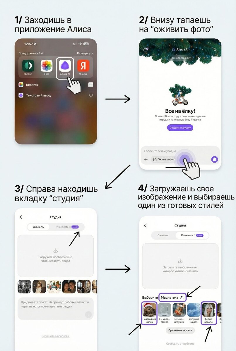 Как? Заходишь в приложение Алиса, внизу тапаешь на оживитель фото, справа находишь вкладку студия. Загружаешь свое изображение и выбираешь один из готовых стилей. Первый плюс — можно попробовать бесплатно, хотя у меня стоит подписка за рубль. Второй момент — разрешают загружать фото детей. Почему разрешают? Потому что ты не можешь писать свои промпты. Только готовые стили из списка :( Функция пока в бете. Лица сильно видоизменяются и скачка в качестве не ждите. Похоже, под их yandex art лежит спрятанный flux. Качество далеко от зарубежных нейросетей. Как по мне, Россия отстает огромными шагами, потому что Яндекс не хочет тратить большие деньги на разработку, в отличие от Google или OpenAI. Да и нет у нас таких денег, так что будем юзать то что есть… Развлечься с семьей на каникулах — отлично. Каждая третья попытка выдает что-то смешное. Но для серьезных задач лучше использовать проверенные инструменты. ПЫ СЫ схему-туториал нарисовала Nana Banana Pro)