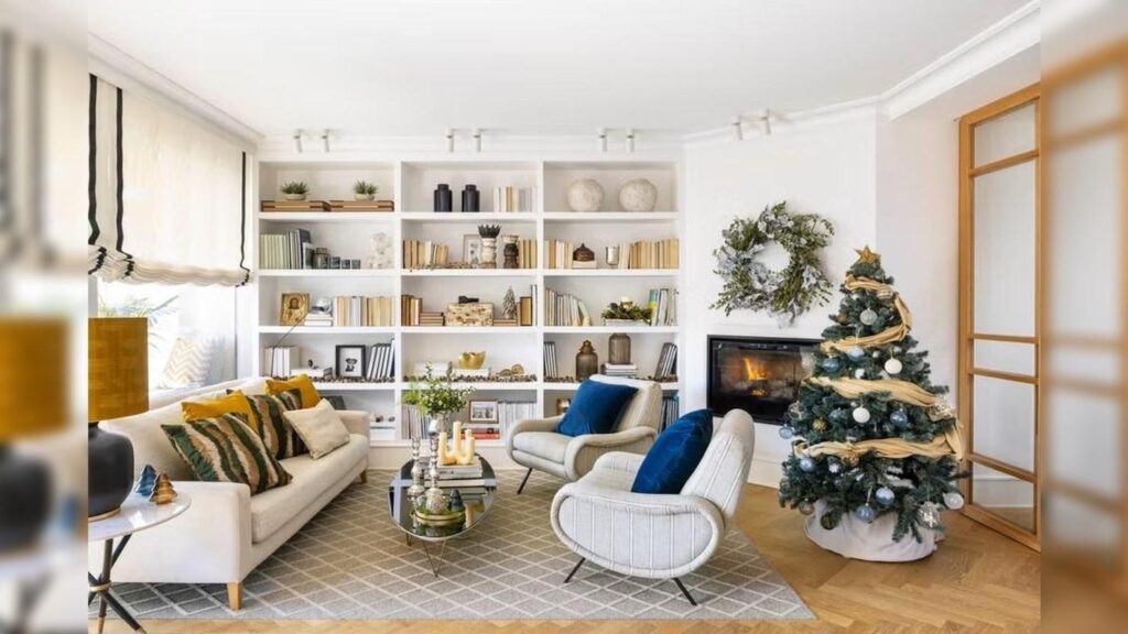 Новогодняя ёлка в гостиной Ракели Гонсалес не перетягивает на себя всё внимание. Она вписана в интерьер так, словно всегда была частью пространства.