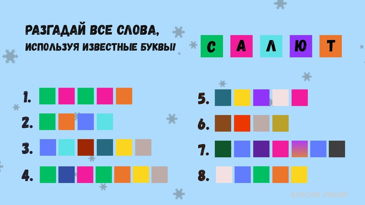 Цветовая криптограмма — это способ зашифровать слова или сообщения с помощью цветов вместо привычных букв и символов. Вместо слов мы видим последовательность цветов, каждый из которых соответствует определённой букве или символу. Попробуйте разгадать, что зашифровано на картинке, имея ключ в виде букв слова САЛЮТ. Будьте внимательны! Нюансы в виде оттенков могут сбить с толку. Пишите свой результат в комментариях! Ставьте палец вверх, если нравятся такие головоломки👍А если хотите регулярно тренировать свой мозг новыми интересными заданиями - подписывайтесь и получайте дозу каждый день!😉 👉Кликай сюда! Здесь собраны лучшие головоломки!👈