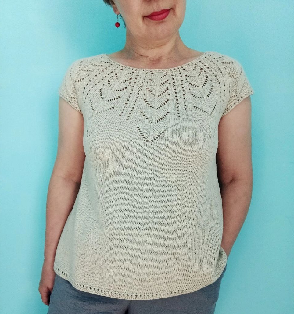 Пряжа бобинная Gomena, состав: 70% хлопок, 30% лён. Метраж - 1650 м/100 гр. Цвет - натуральный цвет льна. Связано в 4 нити на спицах номер 3,25. Рапорт узора кокетки 16 петель. Я набирала 10 рапортов плюс 1 петля для замыкания в круг. Наборный край спицами 2,5. Ряд изнаночных петель, затем ряд ажура (две петли вместе, накид....), ещё ряд изнаночных петель. Затем на спицах 3,25 отвязала кокетку по схеме, разделила на перед, спину, рукава, продолжила вязать до необходимой ширины изделия, делая прибавления по регланным линиям в каждом втором ряду, выполнила азиатский росток по спине, набрала петли подреза, замкнула петли в круг, продолжила вязать вниз, делая прибавления по бокам для А-силуэта. Расход пряжи на 48 размер составил 200 гр.