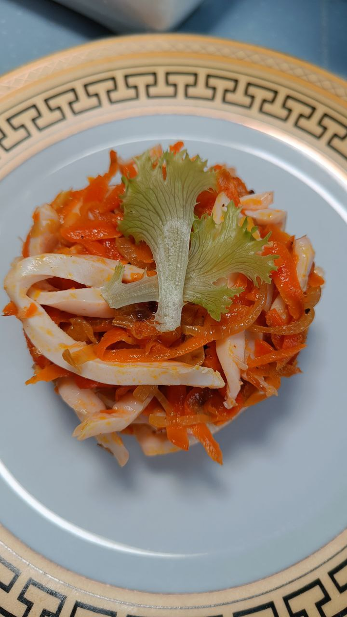 Вечером, когда после долгого дня особенно сильно хотелось чего-то легкого, свежего и при этом вкусного, я решила приготовить салат с кальмарами и овощами, простой, но в то же время очень аппетитный и сытный вариант блюда, которое не требует много времени и сложных ингредиентов. - Кальмары — можно тушку 2 шт. (около 300 г) или готовый, соломкой в рассоле. - Лук — 1-2 шт. (около 150 г) - Морковь — 1 шт. (около 100 г) - Масло растительное — 1-2 ст. л. (15-30 мл) - Соль — по вкусу - Черный перец — по вкусу В холодильнике у меня как раз лежали кальмары в рассоле, нарезанные соломкой, примерно 180 грамм этого было достаточно, чтобы сделать две полноценные порции. Морепродукты всегда отлично сочетаются с овощами, и я хотела подчеркнуть этот вкус, сделав салат максимально уютным и питательным. Для начала я подготовила овощи. Взяла одну крупную луковицу, около 150 грамм, нарезала тонкими полукольцами. Лук это тот ингредиент, который при жарке до золотистого цвета раскрывает свой сладковатый и