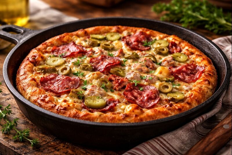 Добавьте соус и начинку: Сверху на сырое тесто аккуратно нанесите капли томатного соуса (не размазывайте сильно, чтобы не смешать с тестом). Равномерно распределите мясную нарезку, огурчики и оливки. Сырный слой: Обильно засыпьте всё тертым сыром. Сыр создаст «крышку», которая сохранит начинку сочной. Запекание:В духовке: 10–15 минут при 190–200°C до румяных краев.