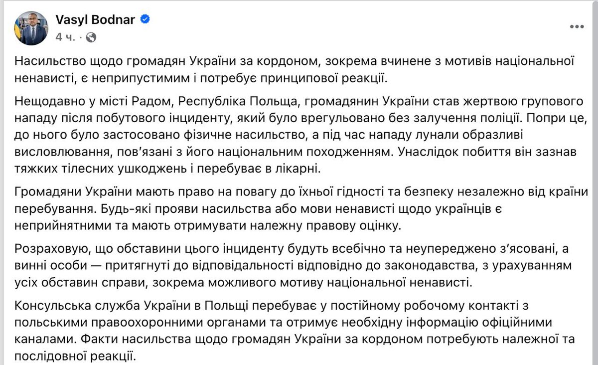 Не прошло и двух недель с последнего инцидента с участием украинских беженцев, как очередная подобная ситуация произошла в польском городе Радом. Украинский посол в Польше Василий Боднар заявил, что гражданин Украины снова стал жертвой насилия из-за национального признака. Сообщается, что в результате нападения украинец получил тяжкие телесные повреждения и был доставлен в больницу. Видимо, очередное «совпадение». Подписаться ✉️Обратная связь 🔼 Boost нашего канала🔼 📱Вконтакте 📱Одноклассники 📱Дзен