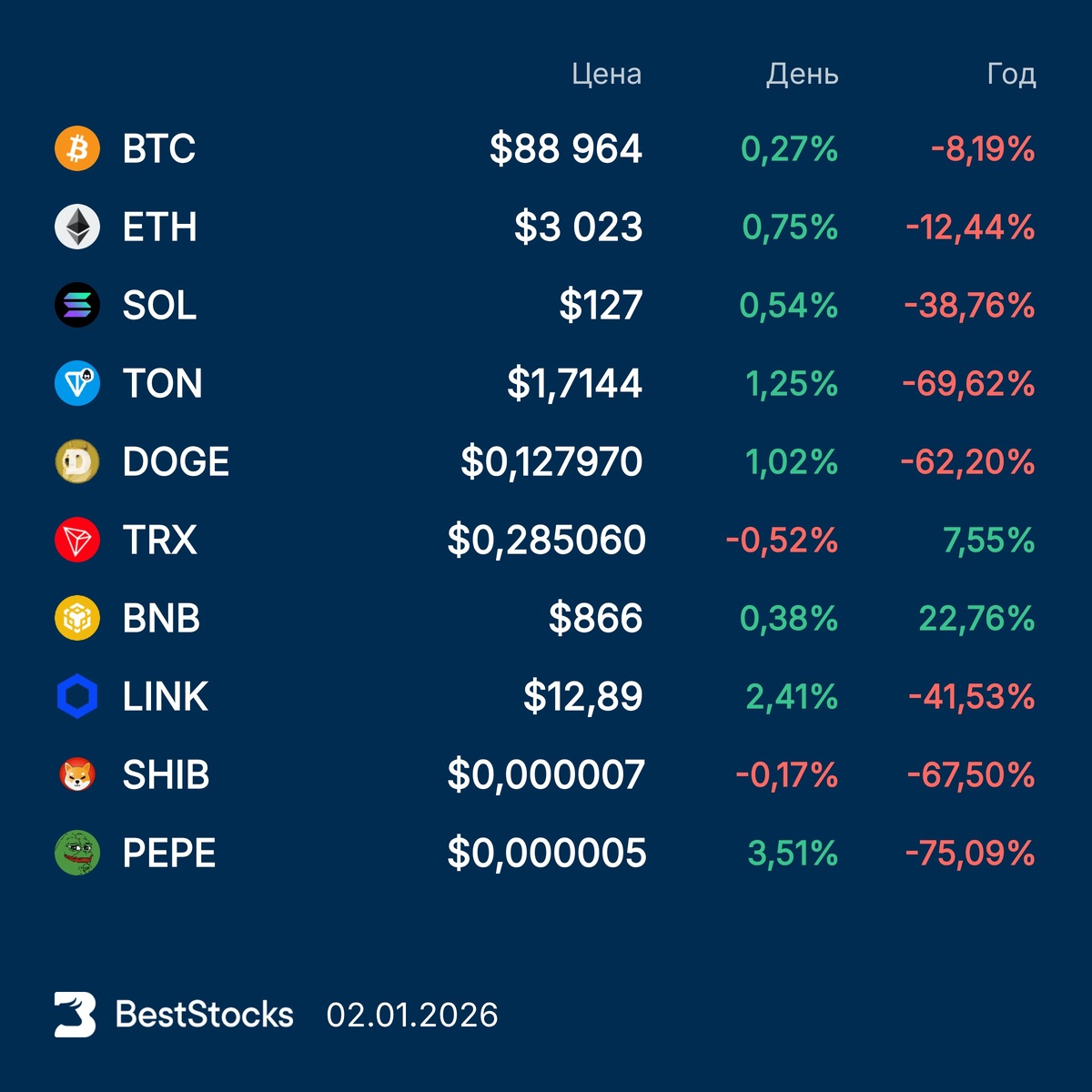 Курсы основных криптовалют: Bitcoin, Etherium, Solana, Toncoin, Dogecoin, TRON, BNB, Chainlink, Pepe, Shiba Inu на текущий момент