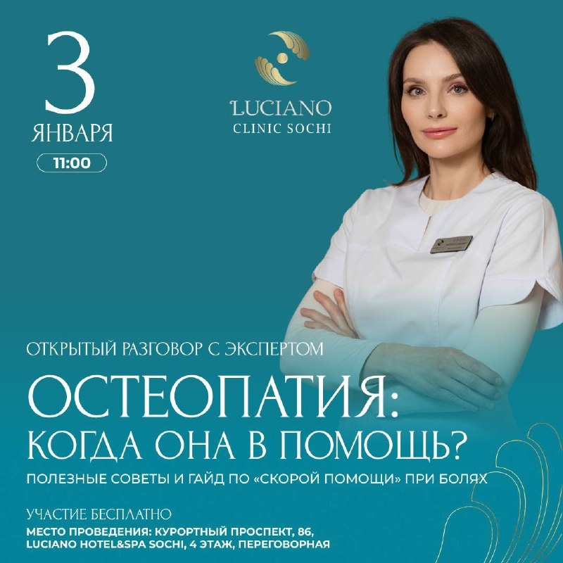 ! Приглашаем на открытую встречу с экспертом LUCIANO CLINIC: «Остеопатия: когда она в помощь?» 📅 3 января в 11:00 Это ваш шанс в неформальной обстановке узнать: • Кто такой остеопат и как он может помочь именно вам — знакомство с доктором клиники. • Реальные случаи и эффективность методов: когда остеопатия творит чудеса. • Полезные лайфхаки и гайд по «скорой помощи» при болях в спине, шее, суставах. Не упустите возможность задать вопросы профессионалу и получить персональные рекомендации. Количество мест ограничено. Заботьтесь о своём теле осознанно. Встретимся 3 января! Место проведения: Курортный проспект, 86, LUCIANO HOTEL&SPA SOCHI Участие бесплатное, запись обязательна +7 (862) 300-04-02 и на сайте ТГ канал МЕД.ЦЕНТРА LUCIANO SOCHI