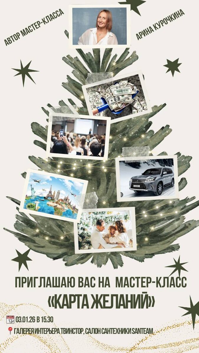 Время чудес , которое погружает нас не только в состояние ожидания чуда, но и в понимание, чего хотим , куда идем дальше. Помогает внутри себя ощутить, что же все-таки в согласии с нами и позволяет процветать, а что нет 🤗 Приглашаю вас на МК «Карта желаний» 🤩😍 которая исполняется у многих 😉 📆 03.01.26 в 15.30 📍галерея интерьера ТВИНСТОР, салон сантехники SANTEAM ⚡️автор, ведущий мастер-класса Арина Курочкина 💸МК за донейшн, который уходит в благотворительность Регистрация: http://santeampro.tilda.ws/wishcard Дата 03.01.26 выбрана неспроста , это будет полнолуние , сакральное время, 16 лунный сутки , символом которых является бабочка , как раз для преобразования и желаний. А накшатра Пунарвасу про гармонию и процветание. Для начала хороша 🤩 ну а субботнего Сатурна мы задобрим служением в виде благотворительности , а так же духовной составляющей в целях , проведем практику сонастройки 😍😘 Что будет необходимо : ⁃ Ватман а3,а2,а1 (кто как хочет) - можно вешать будет потом на