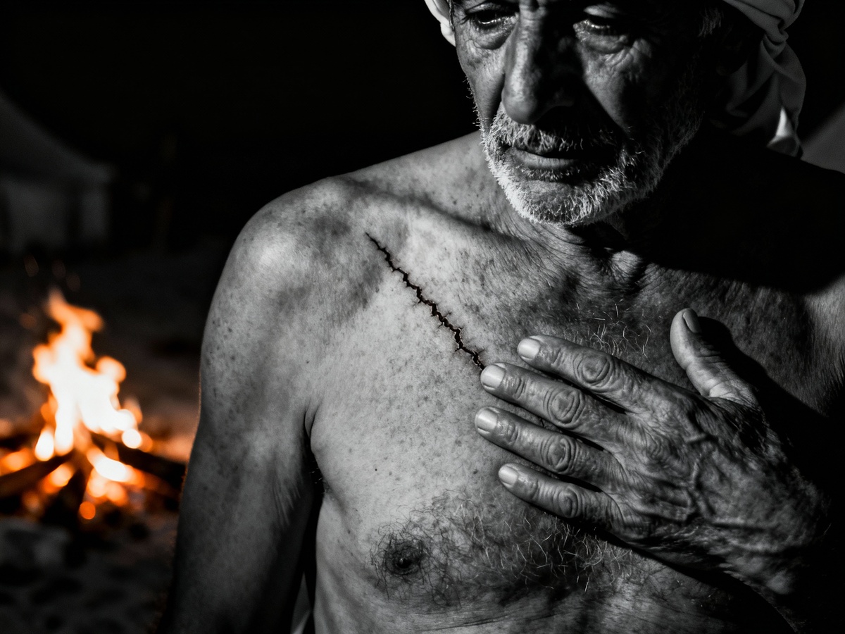 Разгадка пришла неожиданно, в одну из тех редких, почти мистических ночей, когда пустыня замирала, и даже ветер, казалось, прислушивался к тишине. Мы сидели вдвоём у потухающего костра после долгого дня. Ягода спала, положив тяжёлую голову мне на колени. Салим что-то чинил, его пальцы ловко работали с верёвкой. И вдруг - сам, без единого моего вопроса - он положил инструмент, потянулся, и его рубашка расстегнулась чуть шире, обнажив тот самый шрам при свете углей. Он не смотрел на меня. Он смотрел в огонь, а его голос был низким и ровным, как отдалённый гром перед бурей.