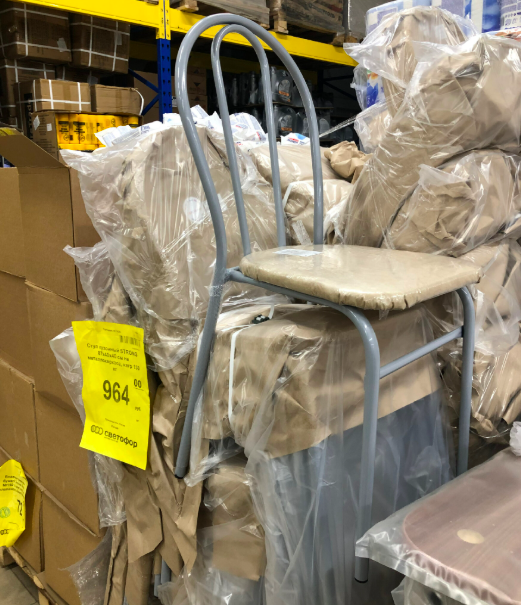 Начну с крупногабаритных и полезных вещей для дома. В продаже есть кухонный стул на прочном металлическом основании. Сиденье выполнено из экокожи, смотрится аккуратно и практично в уходе. Производство российское, выдерживает нагрузку до 130 кг. За свою цену — 964 рубля — вариант вполне достойный для кухни или дачи.