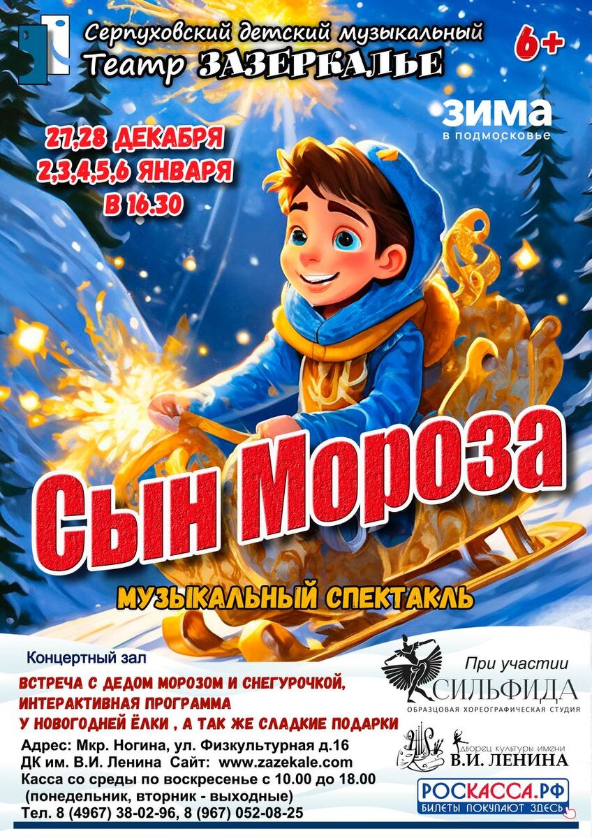 ✨ Новогодний спектакль «Сын Мороза» 🧊 💃⏰С 27 декабря по 6 января 👉Перед спектаклем будет интерактивная программа с участием Дед Мороза и Снегурочки. Спектакль: Знали ли вы, что у Деда Мороза есть сын? И его, как и всех, пытались женить, но найти невесту оказалось не так-то просто! 😄 👉Спектакль проходит в концертном зале ДК им. В.И. Ленина. 🎟️Билет можно купить с подарком онлайн Билет 600₽, подарок 550₽ 🚫 Возраст: 6+ 🏢 Серпуховский детский музыкальный театр "Зазеркалье" 📍 г. Серпухов, мкр-н Ногина, ул. Физкультурная, 16 в ДК им. В. И. Ленина 🎫 Купить билет: http://zazerkale.com/ ⭐Поддержать канал голосом 💰 Канал Вакансии Серпухова ✅ Мероприятия Серпухов https://dzen.ru/id/66f01c6eb4c6fe60c9ca1608 http://vk.com/serpukhov_events http://dzen.ru/serpukhov_events