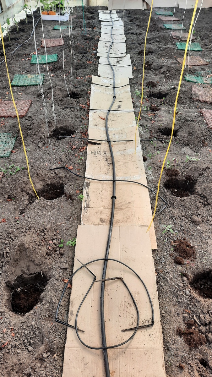 Долго я засматривалась на подобную конструкцию. Потом решилась купить и снова убрала подальше. Почему-то было стойкое ощущение, что сложно будет с ней справляться… И вот этой весной все звёзды сошлись. Мне племянник помог с бочкой разобраться, а уж саму систему за день я соорудила. И совсем это не архисложно. Очень понятная внутри схема-инструкция. Вначале я разложила составляющие на земле. У меня система российского производителя «Жук». Рассчитана на 60 растений. Потом примерно прикинула, где именно и сколько корней томатов и огурцов я собираюсь размещать. Под главную ветку (трубка-шланг) я подложила картон. Это совсем не обязательно, но с ним чуть легче ухаживать впоследствии за овощами. Распределила отводные трубочки с капельником на конце. Каждому растению досталось по трубочке. Все составляющие и переходники были в комплекте. Конструкцию мне подключили-присоединили к бочке с водой. Она поднята над уровнем земли примерно на метр. Раньше я могла брать лейками воду и поливать теплицу