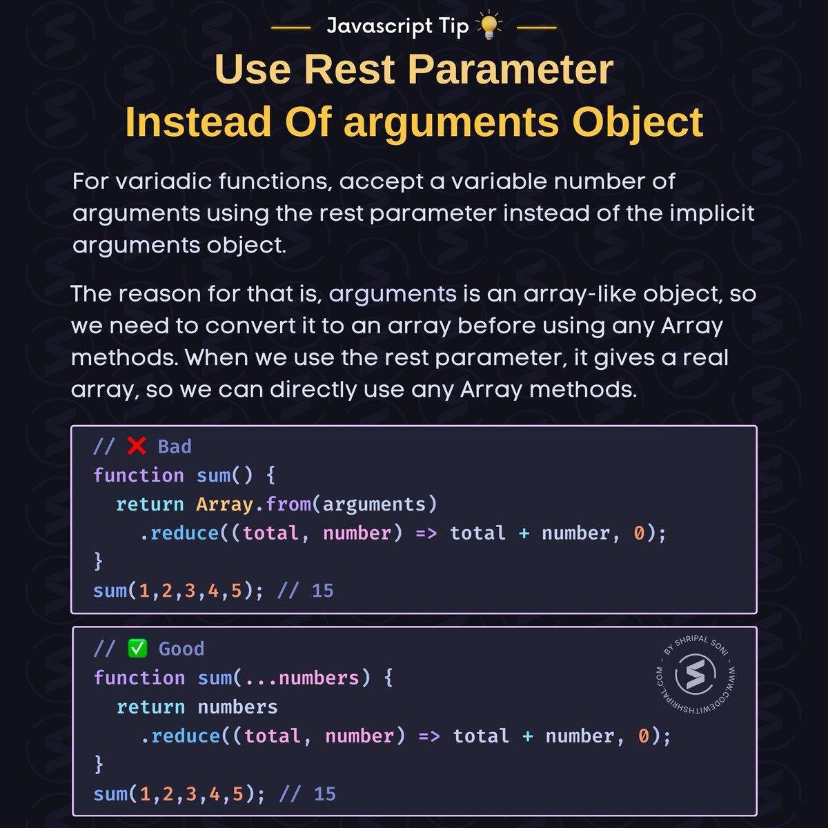 Используйте параметр rest вместо объекта arguments для приема переменного количества аргументов ✅