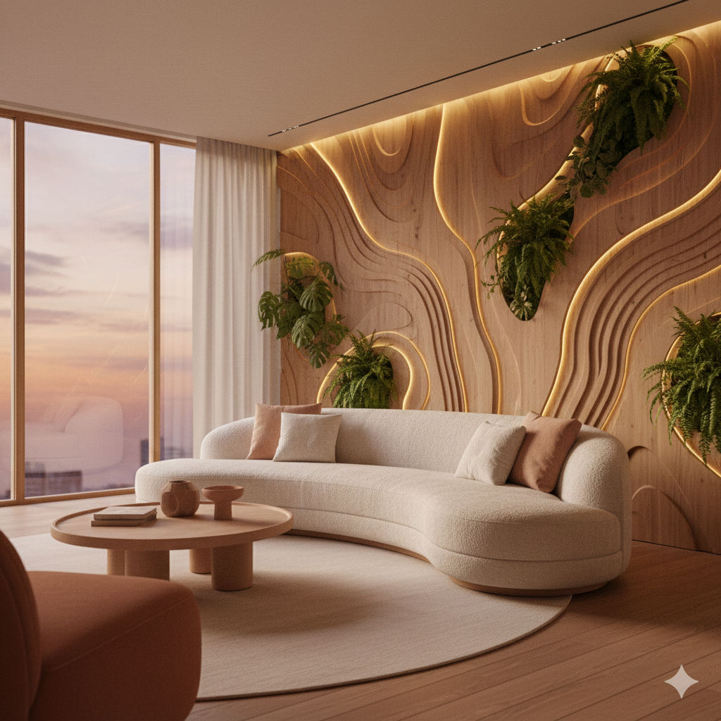 Польза: Это не только красиво, но и функционально — такие поверхности идеально поглощают шум, превращая городскую квартиру в тихий кокон.