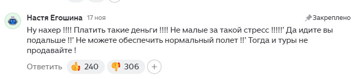 И вот тогда звучит та самая фраза, как в комментарии выше: «Ну нахер !!!! Платить такие деньги !!!! Не малые за такой стресс !!!!! Да идите вы подальше !! Не можете обеспечить нормальный полет !! Тогда и туры не продавайте !»