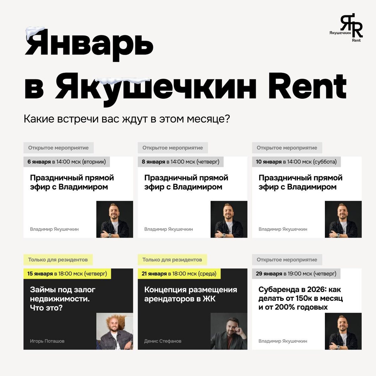 🚀 Делюсь афишей встреч на январь. Месяц получился насыщенным: будут и открытые эфиры для всех, и закрытые мероприятия для резидентов сообщества. Но в каждом из них — максимум практики, разборы реальных кейсов и стратегия на 2026 год. Разбираем по датам 👇🏻 🗓️ 6 января, 14:00 МСК (вторник) Открытый праздничный прямой эфир Спикер: Владимир Якушечкин + резидент сообщества «Якушечкин Rent» Регистрация: будет открыта для всех ✅ 🗓️ 8 января, 14:00 МСК (четверг) Открытый праздничный прямой эфир Спикер: Владимир Якушечкин + резидент сообщества «Якушечкин Rent» Регистрация: будет открыта для всех ✅ 🗓️ 10 января, 14:00 МСК (суббота) Открытый праздничный прямой эфир Спикер: Владимир Якушечкин + резидент сообщества «Якушечкин Rent» Регистрация: будет открыта для всех ✅ 🗓️ 15 января, 18:00 МСК (четверг) Закрытый эфир для резидентов Тема: Займы под залог недвижимости. Что это? Спикер: Игорь Поташов Регистрация: только для резидентов сообщества 🤍 🗓️ 21 января, 18:00 МСК (среда) За