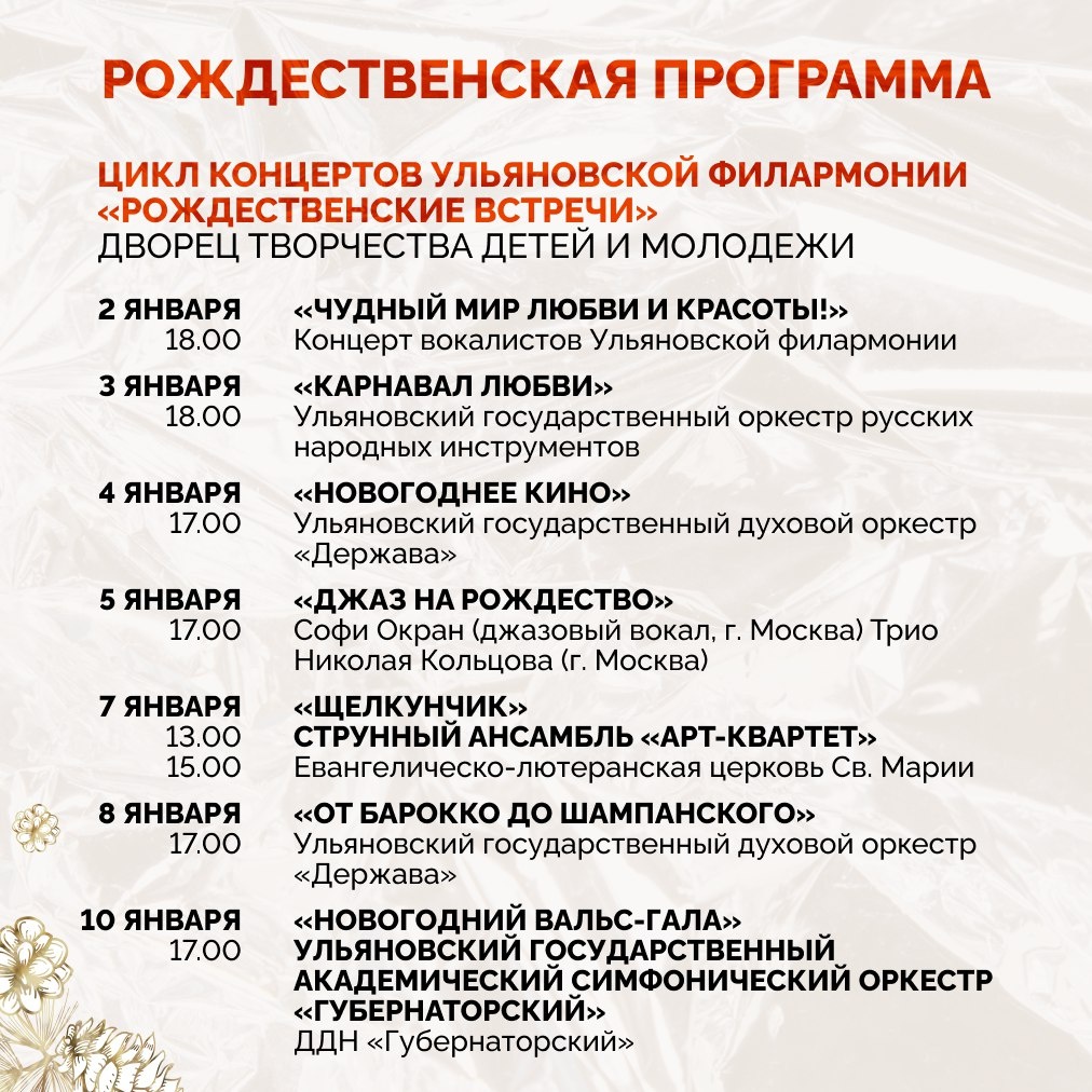 Проведите это чудесное время в компании родных под музыку ульяновских коллективов или примите участие и в развлекательной программе на Соборной площади. Наполните свои сердца радостью и вдохновением в этот праздник. Рождественская программа – в карточках!