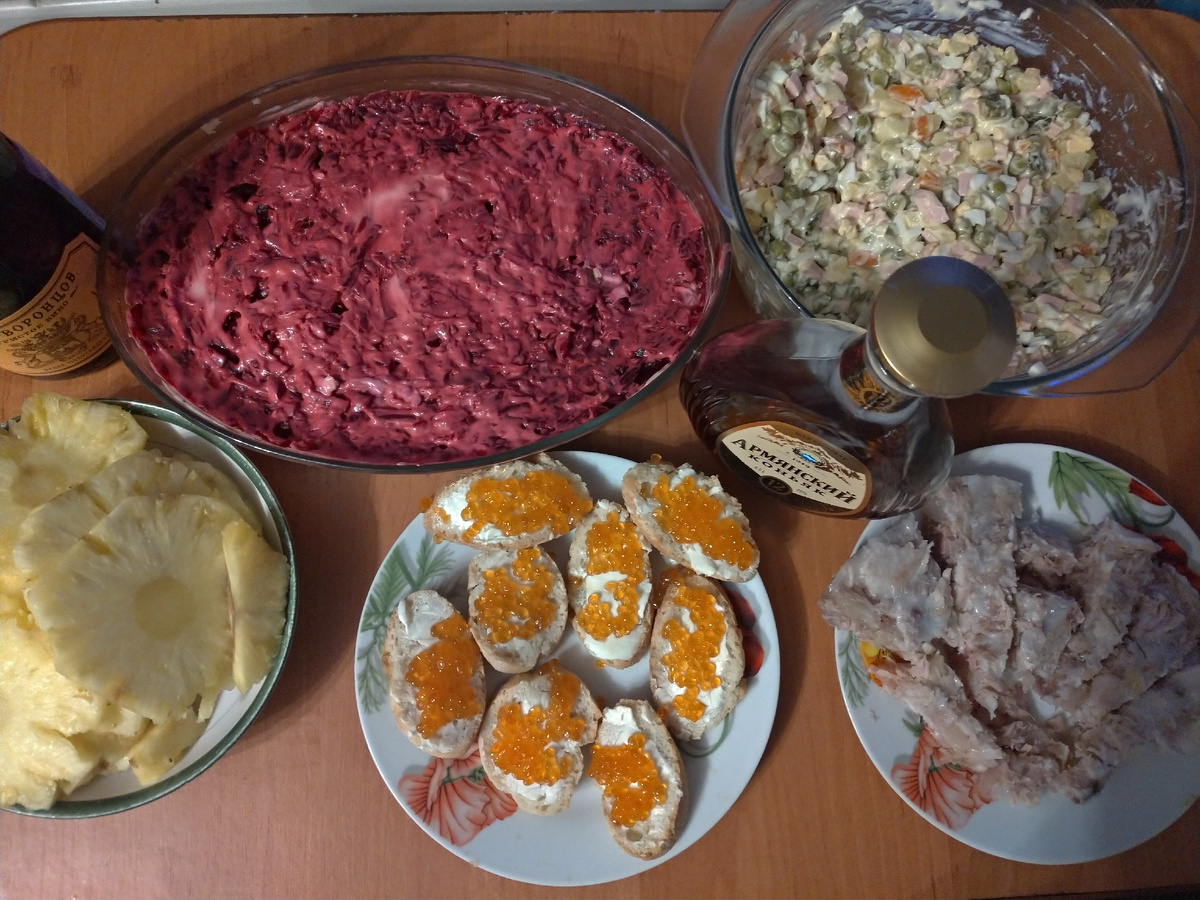 Сделали оливье, Цезарь, достали свеклу на Селёдку под шубой. А селёдку то купить мы забыли)
