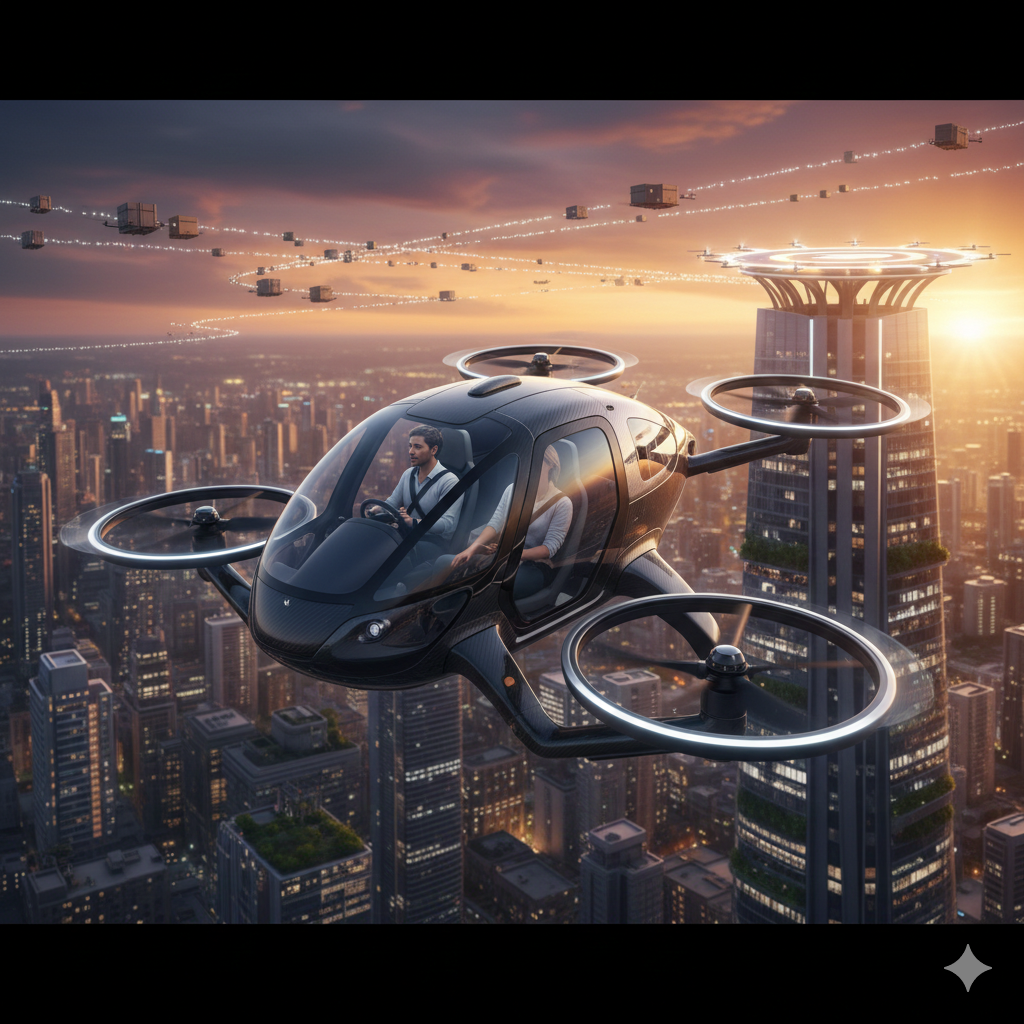 Воздушное такси: Заказать «полет» до аэропорта теперь не сложнее, чем обычное такси. Это бесшумные электрические капсулы, которые управляются ИИ-пилотом под контролем наземного центра.