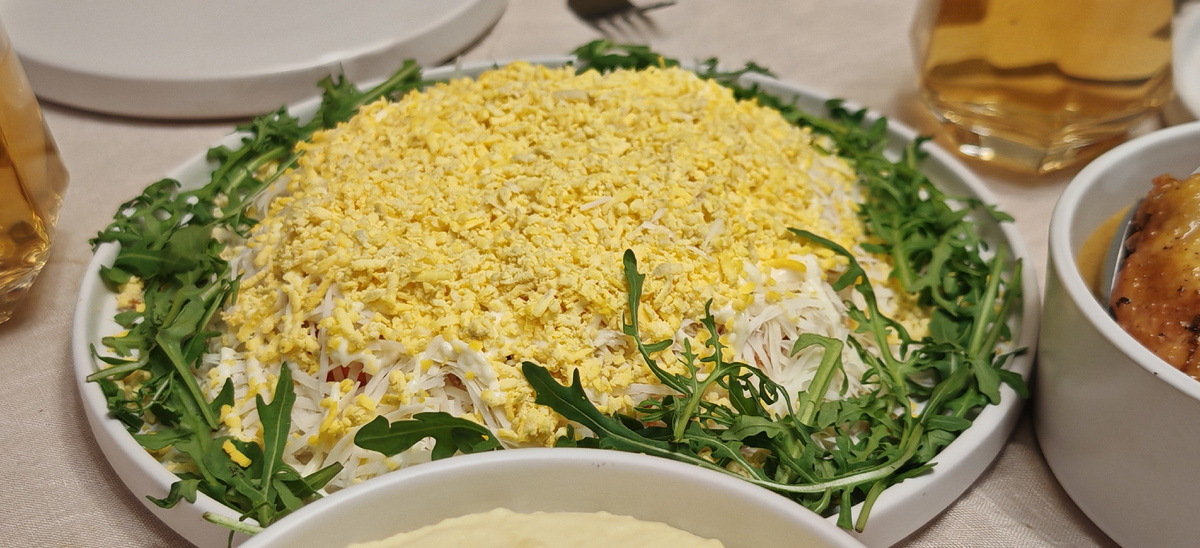 В салате яйца, копчёная семга, крымский лук, яблочко, пармезан и немного майонеза. Еще слои просыпаны мороженым потёртым сливочным маслом. Калорийная бомба, но очень вкусная. В "жирные" года сверху я еще клала икру. Но не в этом. Надеюсь, что к наступающему 2027 икра на салате будет!