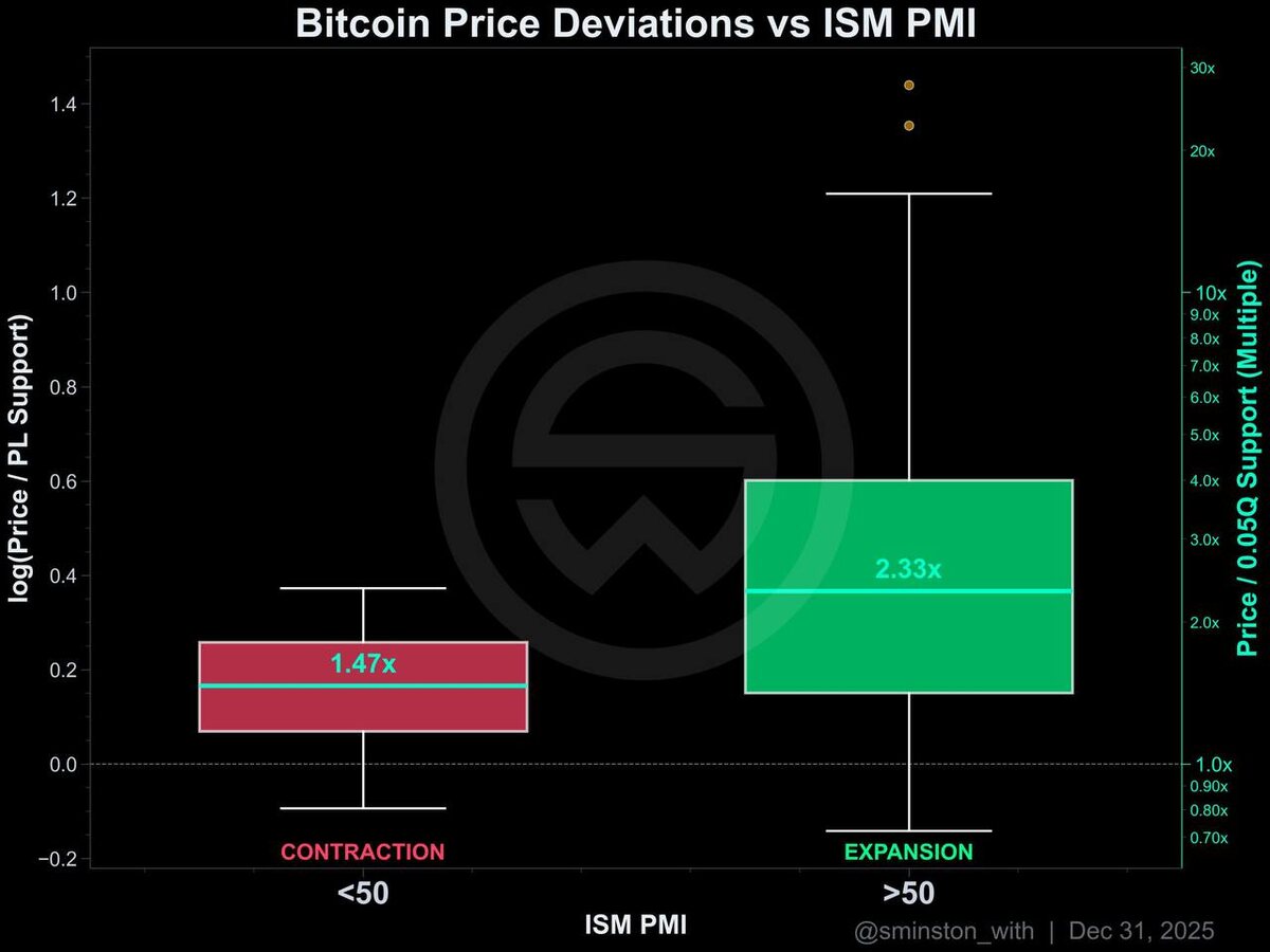 Смотрю на это исследование от Sminston (одного из лучших BTC аналитиков) и ловлю себя на мысли, насколько иногда всё проще, чем мы привыкли думать. Когда PMI ниже 50 — экономика в фазе сжатия. В этот момент биткоин в среднем торгуется примерно на 1.47x выше power law поддержки. Диапазон узкий, разброс небольшой, рынок будто зажат. Когда PMI поднимается выше 50 — начинается экспансия. И медиана сразу уезжает к 2.33x. Причём то, что считается верхом нормы в фазе сжатия, в фазе роста — это уже «середина температуры по больнице». И это не красивая история для твиттера. 26% вариации цены биткоина объясняется всего одним макроиндикатором. R² = 0.26, p-value настолько маленький, что говорить о случайности просто не приходится. Что для меня здесь особенно важно — характер распределения. В сжатии всё аккуратно, компактно, без фейерверков. И именно в этой коробке мы сейчас и находимся — PMI около 48. А вот когда экономика выходит из сжатия… Распределение «взрывается». Не линейно, не аккурат
