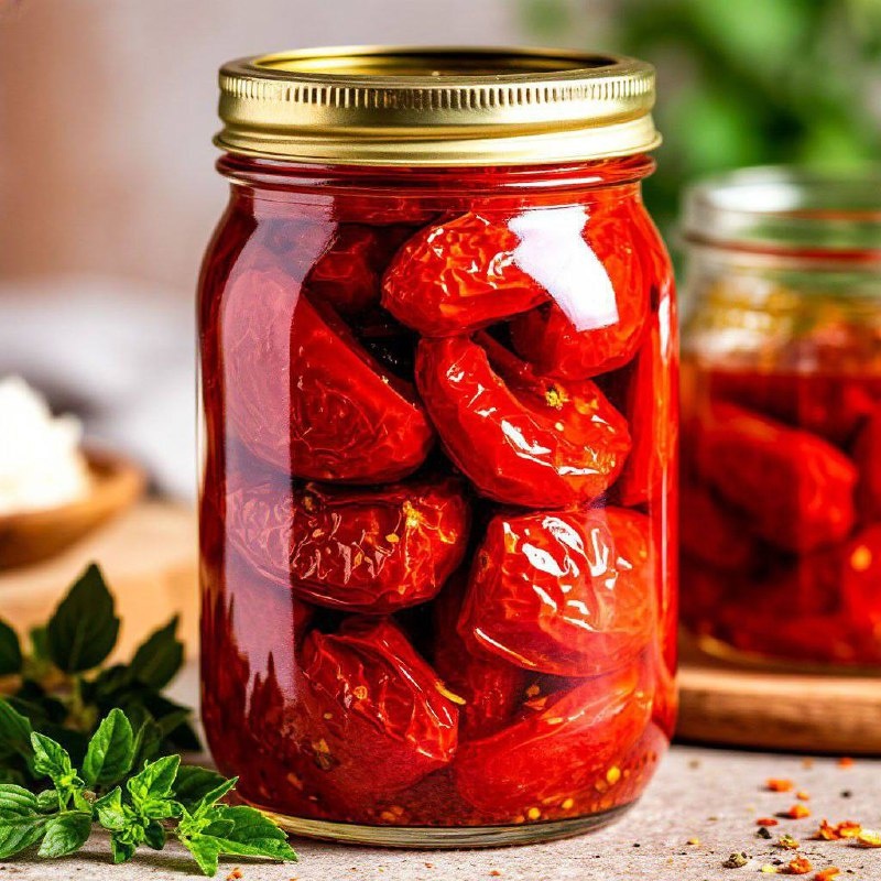 📖 Ингредиенты: - Небольшие помидоры — 3 кг - Соль — 2 ч. ложки - Сушёный базилик — 1 ч. ложка - Сушёная орегано — 1 ч. ложка - Сушёный тимьян — 1 ч. ложка - Оливковое масло — 2–4 стакана 🧑🏻🍳 Приготовление: 1․ Разрежьте помидоры пополам. Вырежьте жёсткие места крепления плодоножек. Аккуратно выскоблите семена и окружающую их жидкость. 2․ Соедините соль и травы. Разложите помидоры в один слой в керамические или стеклянные формы срезом вверх. Присыпьте их смесью специй. 3․ Поместите в духовку, разогретую до 75 °C на 3 часа. Оставьте дверку открытой примерно на 7–8 см. 4․ Затем переверните каждый кусочек помидора и прижмите лопаткой. 5․ Продолжайте сушить помидоры, переворачивая их каждые пару часов и прижимая лопаткой. При этом вынимайте уже готовые. 6․ Остудите их и разложите по чистым банкам. Залейте оливковым маслом и закройте крышками.