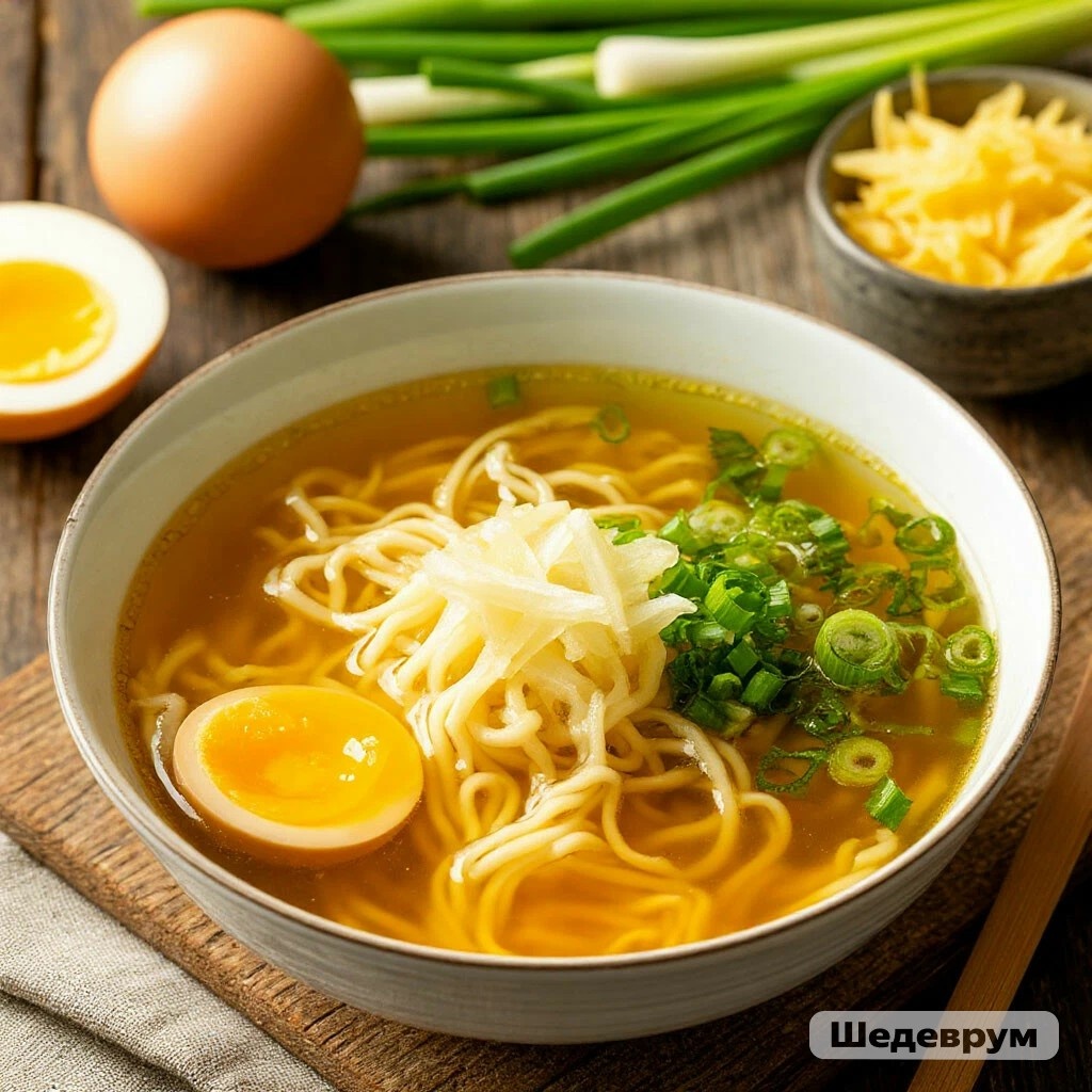 Мяу, те, кого мутит, но нужно что-то горячее и бодрящее! 🍜 Этот бульон — как ударная доза здравомыслия. Горячий, солёный, с убийственным ароматом имбиря и чеснока, которые пробивают любую тошноту и головную боль. Лапша добавит сил, а яйцо — белка. Пить маленькими глотками, как лекарство!