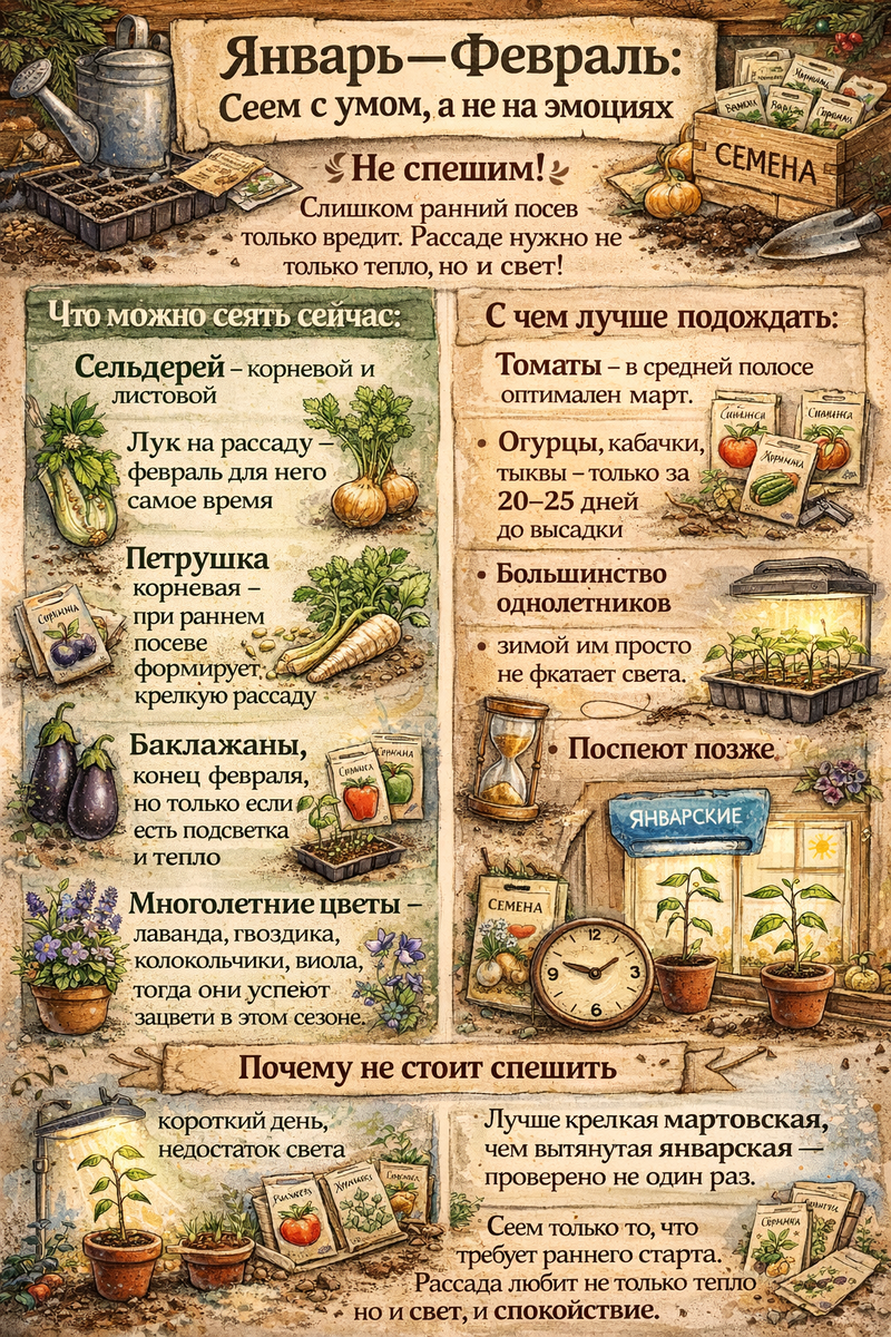 Начало года — опасное время для садовода. Руки тянутся к семенам, глаза разбегаются, кажется, что если не посеять сейчас — всё пропало. На самом деле всё наоборот: слишком ранний посев часто только вредит. Не каждой культуре нужен такой старт. Вот ориентир, что действительно имеет смысл сеять в январе–феврале, а с чем лучше не торопиться. Что можно сеять сейчас: Сельдерей — корневой и листовой. Растёт долго, всходит медленно, без раннего посева хорошего результата не даст.