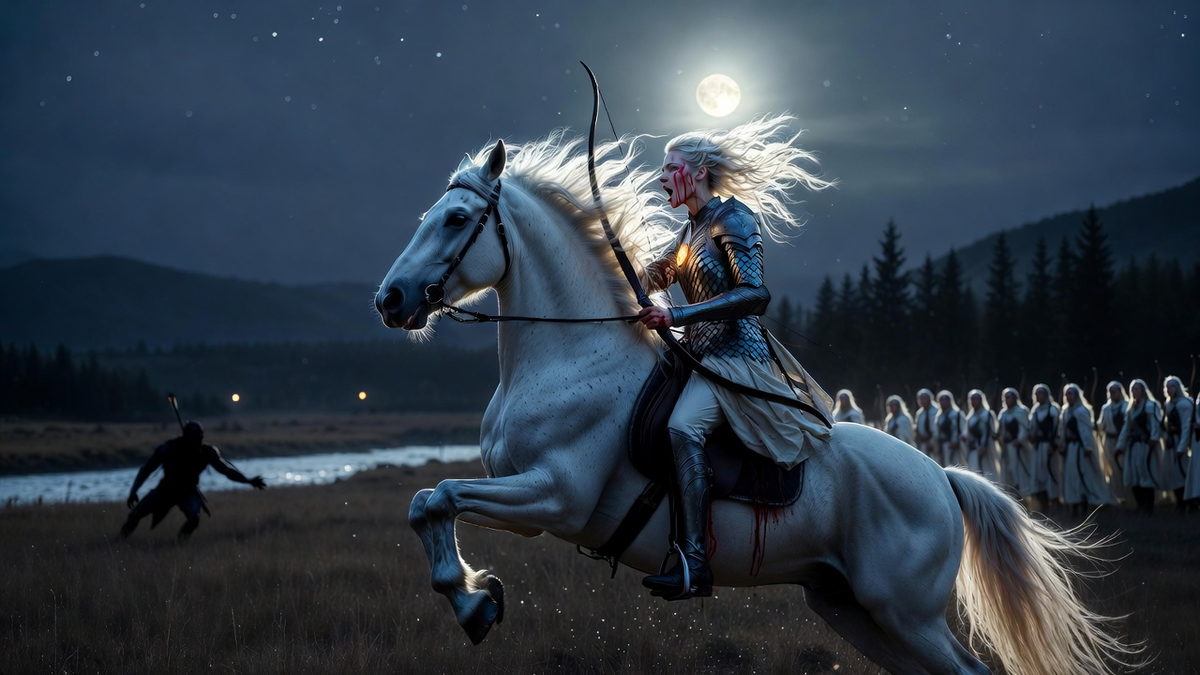 Аэлинэль мчалась на Аэросе сквозь ряды, её конь фыркал, чувствуя битву. Она стреляла на скаку — навык, что оттачивала годами: натянуть тетиву, прицелиться, выпустить, пока ветер хлещет по лицу. Стрела за стрелой находили цель: один орк-лучник упал с пробитым глазом, другой — с горлом, разорванным насквозь. Аэрос поворачивал резко, как лист на ветру, и Аэлинэль чувствовала ритм — дыхание коня, свист стрел, крики врагов.