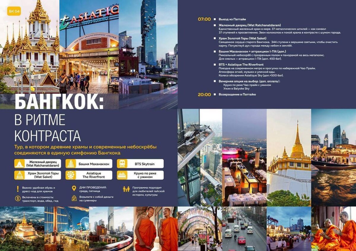 ❗️ 🌆 Бангкок в ритме контрастов Экскурсия, где за один день вы проживёте два Бангкока: 🛕 тишину древних храмов и 🏙 энергию современного мегаполиса ⸻ 📅 Дни проведения: вторник и пятница ⸻ 🕖 Программа экскурсии 07:00 — сбор по отелям Паттайи Встреча с гидом, знакомство с программой и настрой на день. 08:00 — выезд из Паттайи По дороге — история Бангкока, его символы и культурные контрасты. ⸻ 🛕 Железный дворец (Wat Ratchanatdaram) 10:00–10:30 • 37 металлических шпилей — ступени к просветлению • единственный «железный» храм в мире • мифические Наги — хранители воды Контраст тишины и шума мегаполиса ощущается особенно ярко. ⸻ 🏯 Храм Золотой Горы (Wat Saket) 11:30 Историческое сердце старого Бангкока. 344 ступени — путь к очищению и панораме города с высоты. Место, где соединяются небо и земля, прошлое и настоящее. ⸻ 🏙 Маханакхон 13:00 Футуристический небоскрёб и вид на весь Бангкок. Прозрачный пол, масштаб, скорость жизни — символ современного города. 🔥 I-Tilt — а