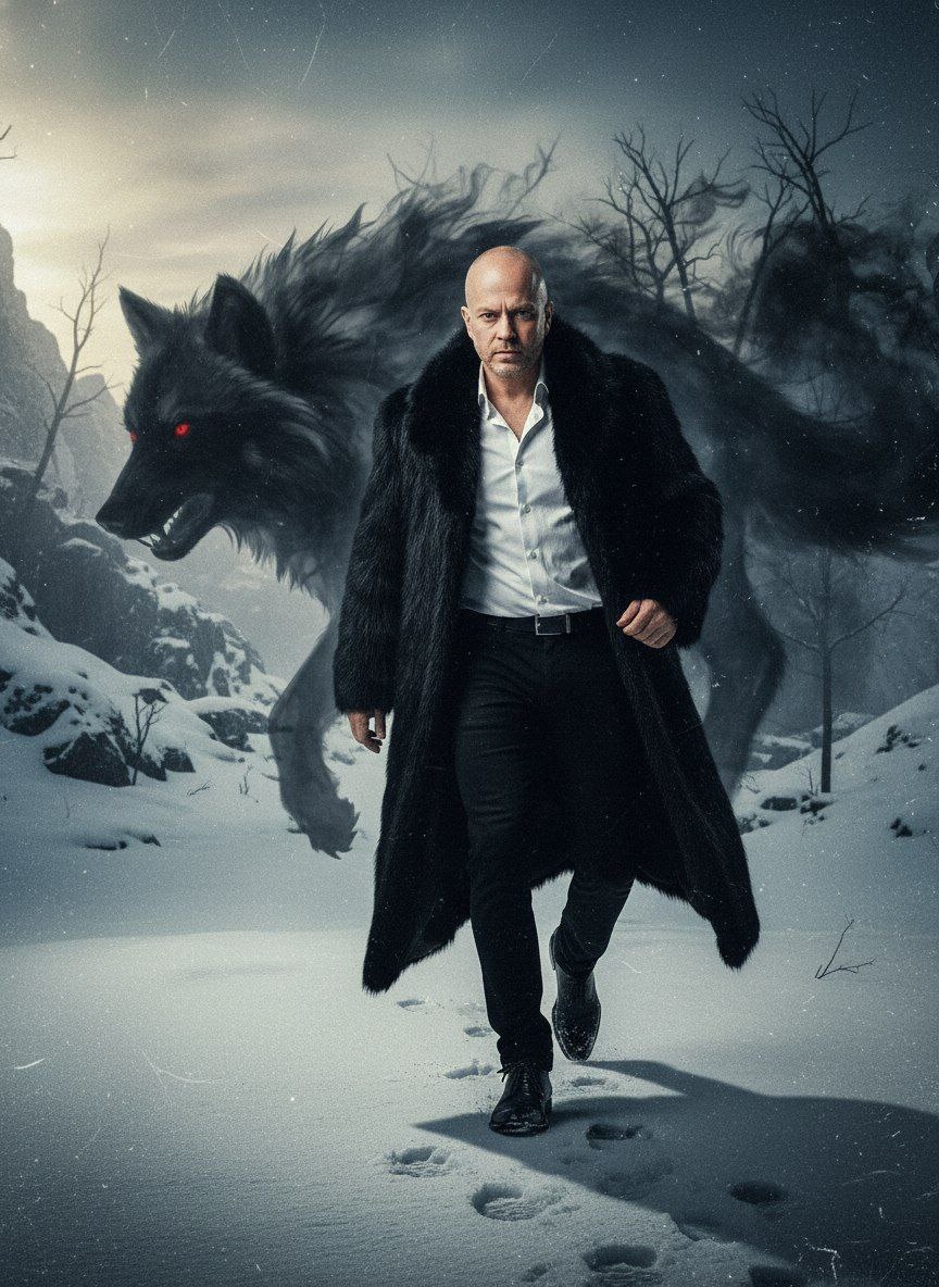 По мере его движения дым постепенно превращается в черного волка слева, что символизирует единство волка и человека. Сцена разворачивается на зимнем фоне. Кинематографическая атмосфера в стиле гранж. Источник света светит сбоку, откуда появляется волк. На переднем и заднем планах снег и зима. Одежда мужчины состоит из черного длинного мехового пальто с отворотом, из которого выглядывает классическая белая рубашка с длинными рукавами и двумя расстегнутыми верхними пуговицами, черных брюк и черных туфель. Лицо не должно быть изменено, лицо на моей фотографии должно быть на 100% похоже, выражение глаз, цвет волос ➡️ Тут БОТЫ 👉 канал в Дзен 💸 Отблагодарить