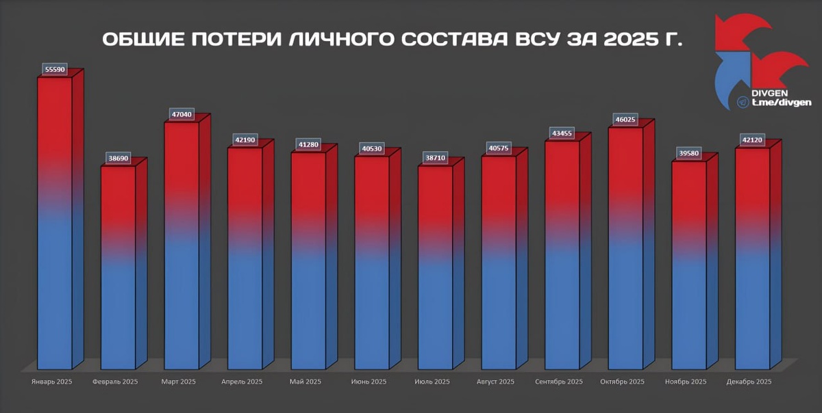 Министерство обороны отражает в сводках приблизительные потери противника только на линии боевого соприкосновения, не считая военнослужащих, погибших в результате применения российского высокоточного оружия большой дальности и авиации в глубине украинской территории. Общие потери личного состава Вооружённых сил Украины за декабрь 2025 года по сводкам МО РФ составили 42120 человек. 🌐 За Русский Мир©Резервный📣Наш Чат✔️Подпишись‼️