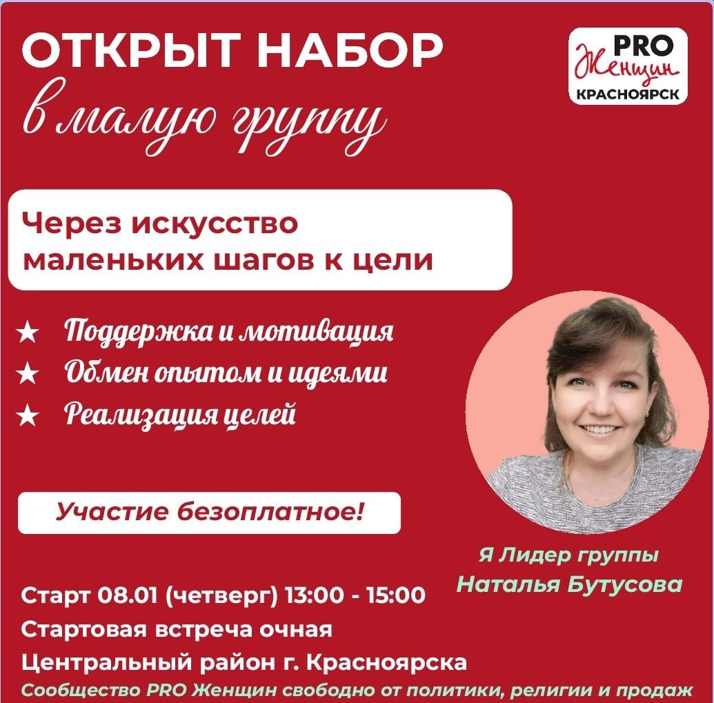 " Участие безоплатное! 🎁 🌹 На связи Лидер сообщества PRO Женщин НАТАЛЬЯ БУТУСОВА Если вы: 🔸 ощутили, что нет движения в делах, не идут процессы; 🔸 хотите новых идей для исполнения задуманных целей; 🔸 чувствуете, что достойны лучшего и обновлений; 🔸 готовы изменить свою жизнь и себя даже на маленький шаг; 🔸 хотите приобрести или повысить навыки адаптации к любым обстоятельствам (адаптивный интеллект, AQ), то моя группа именно для вас! Что вас ждёт в группе в течение первых 8 недель 2026 года: 🌲 Поддержка единомышленниц Мы создадим безопасную среду, где каждая сможет делиться своими проживаниями без оценочных мнений. 🌲 Усиленный фокус Вместе мы будем работать над тем, чтобы понять, чего мы действительно хотим и как этого достичь через НОВЫЕ действия - искусства маленьких шагов. 🌲 Мотивация и вдохновение Мы будем поддерживать друг друга на нашем пути. 🌲 Игра Весь наш путь в группе будет красной нитью пронизан игрой, лёгкостью и улыбками. Вы же помните, что самые большие глу