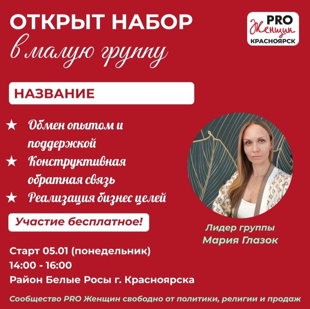 "БИЗНЕС ПРОЯВЛЕННОСТЬ" 🚩Вас приветствует лидер сообщества PRO Женщин - Мария Глазок! Иногда ты чувствуешь, что пришло время, что-то менять в своей деятельности и вот вроде бы и идеи есть и силы, а окружение не поддерживает, у них свои дела и заботы. И ты сливаешься, потому что не с кем даже обсудить свои планы, а ведь это твоя жизнь! В которой твоя бизнес реализация дает возможность раскрыться в новой грани. ✨Я приглашаю тебя в нашу группу, где у тебя будет поддержка в твоей бизнес проявленности. ✨И не важно, это совсем новое дело или ты хочешь масштабировать уже начатое, приходи- результатом будет твой новый доход! На наших встречах можно: ✅Ставить бизнес цели ✅Планировать свои шаги для их достижения ✅Не бояться, что тебя осудят ✅Поддерживать других участниц 🚩"Бизнес проявленность"- это 8 встреч с женщинами, которые создадут поле взаимной поддержки! ✔Старт: 5 января, 14:00-16:00ч. ✔8 встреч по понедельникам ✔г. Красноярск, кафе и рестораны, в районе Белые Росы ✔Участие беспла