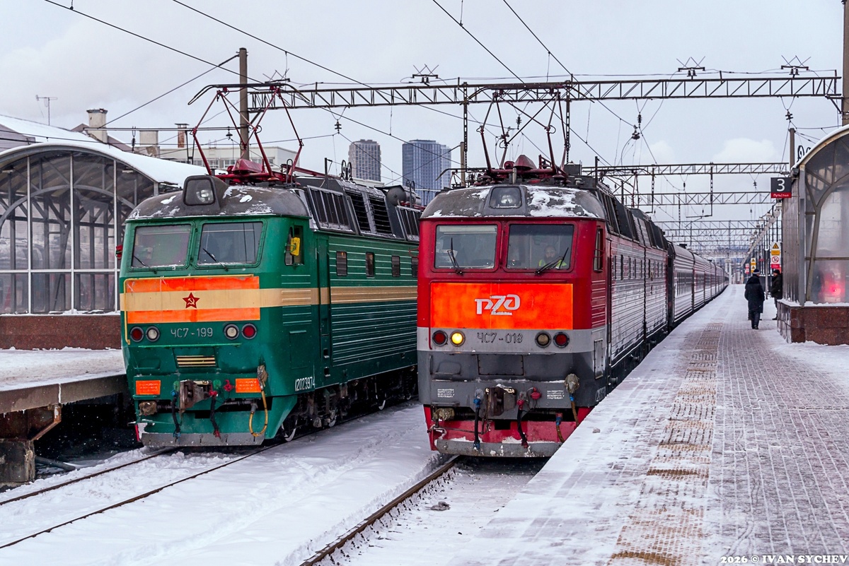 Да, все окончание года сдвинуть меня куда-то было тяжело, и тут пришёл Новый год. И, как говорилось у классиков: «Остапа понесло». Ну не Остапа, а меня, но вчера я в холодную январскую ночь «ловил» ПДМ у Ольгино, а сегодня решил рвануть на Киевский вокзал… Вот что из этого вышло. 1-2. Для начала встретил меня Киевский двумя чехами бок-о-бок. Причем один из них был в зеленом окрасе, что чуть-чуть сбило меня с толку, я подумал, что это старый знакомец ЧС7-084, но оказалось, что так же окрашен и ЧС7-199. Рядом стоял ЧС7-018, и, если мне не изменяет память, то эта машина памятна кому-то из моих читателей. Но могу и ошибиться. 3.Через перрон, на соседних путях, у стены дебаркадера, стоял еще один электровоз той же серии. ЧС7-027 4. Пропавшие было с Горьковки ЭП2ДМ обнаружились здесь. На Нару укатил «Победный» электропоезд ЭП2ДМ-0277. 5. И уже поверившего меня в то, что здесь, на Киевском, одни чехи (а так было почти всегда) весьма удивил ЭП20-026. Не то, чтобы я его не ожидал там увидеть, н