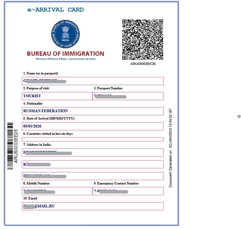 С 1 октября 2025 года все иностранные граждане, въезжающие в Индию с туристическими, деловыми, учебными или медицинскими целями, могут заранее оформить электронную карту прибытия — e-Arrival Card до приезда в страну. Введение e-Arrival Card направлено на упрощение процедуры въезда, снижение очередей и задержек в аэропортах, а также на внедрение современных цифровых технологий миграционного контроля, соответствующих международной практике. ❗ Важно: электронная карта прибытия не является визой и не заменяет электронную или обычную визу. 👉 https://indianvisaonline.gov.in/earrival/. В течение ближайших 6 месяцев система будет работать в тестовом режиме, поэтому при необходимости сохранится возможность заполнения бумажной миграционной карты по прибытии. фамилия и имя (как в паспорте);