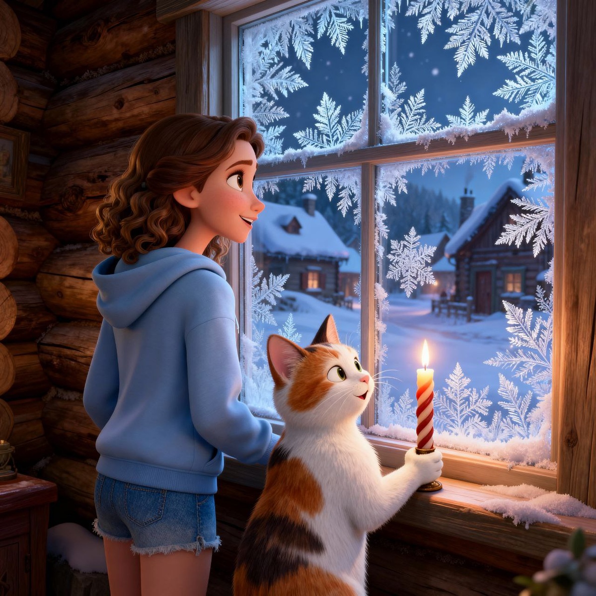 на загруженном фото, (выражение лица – явное восхищение красотой) стоят у окна деревенского бревенчатого дома и смотрят на красивые узоры инея на стекле; кот держит в лапе витую горящую свечу; ракурс – полуоборот сзади; реалистичный 3D-рисунок в стиле диснеевских мультфильмов, позитивные эмоции, юмор, комедия; фокус и акцент на узорах инея на оконном стекле; 9:16 ➡️ Тут БОТЫ 👉 канал в Дзен 💸 Отблагодарить