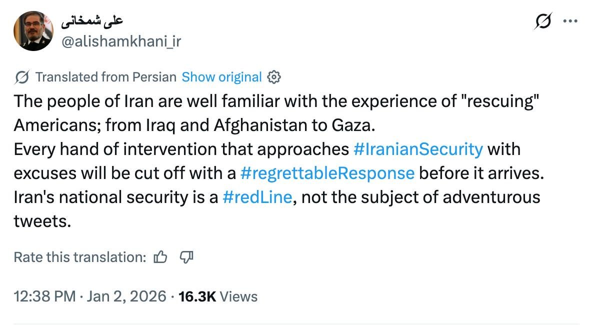 Any interventionist hand that threatens Iran's security will be CUT OFF before reaching target — Ali Shamkhani, Khamenei's top advisor, responds to Trump 'Iranian national security is a red line and not a subject for reckless tweets'