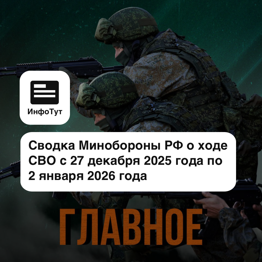 Вооружённые Силы Российской Федерации продолжают проведение специальной военной операции. Об этом сообщили в Министерство обороны Российской Федерации. В ответ на террористические атаки Украины по гражданским объектам на территории РФ с 27 декабря 2025 года по 2 января 2026 года Вооружёнными Силами России нанесены один массированный и шесть групповых ударов высокоточным оружием, в том числе гиперзвуковыми ракетами «Кинжал». Поражены: Нанесено поражение формированиям ВСУ на Харьковском направлении и в приграничных районах.