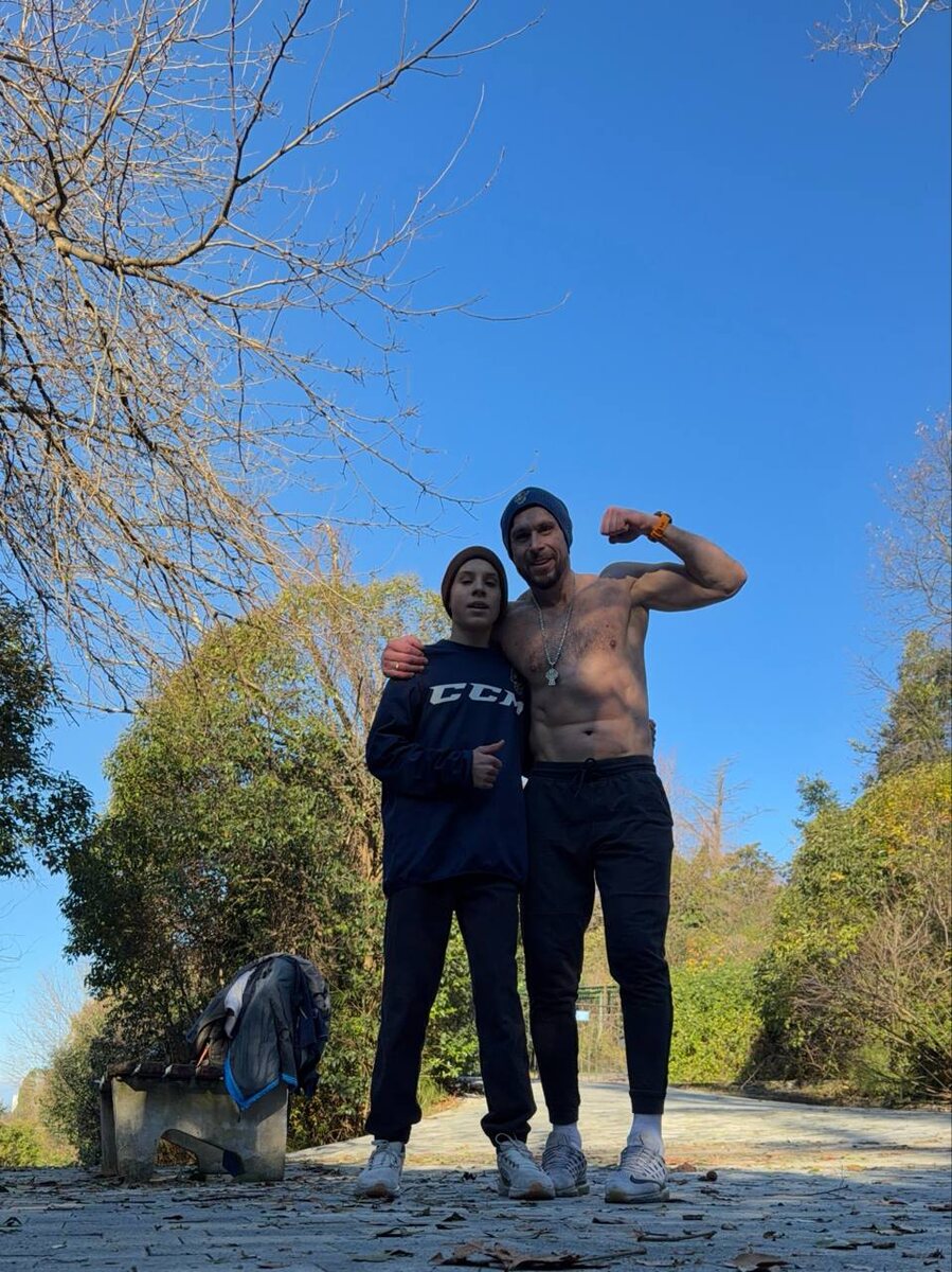 Сегодня мы с сыном пробежали 3 км, сделали комплекс на турниках и брусьях по 10–12 повторений, а после — водные процедуры!