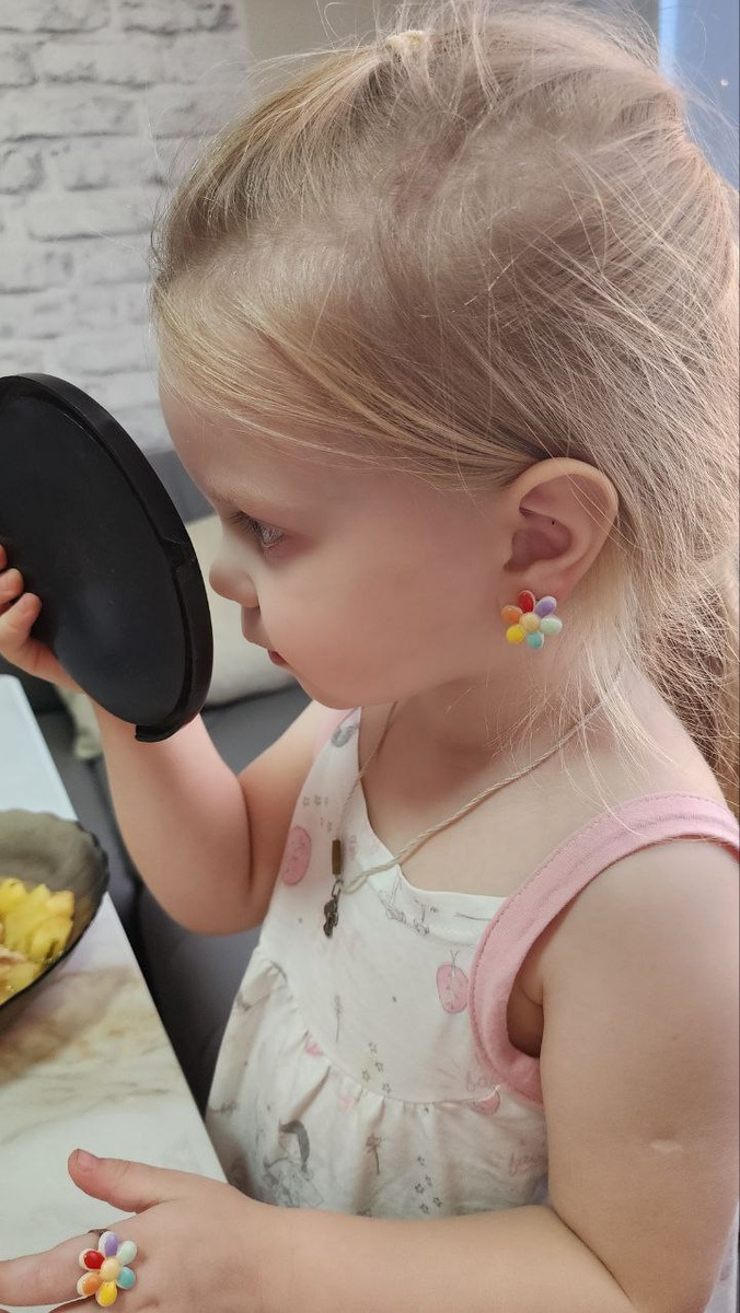 Примеряем клипсы уже понимает что такое серьги на ушках, мои постоянно серьги рассматривает, надела ей клипсы, чтоб привыкала и по-моему она готова уже прокалывать ушки, я ждала этого момента🥰🥰🥰