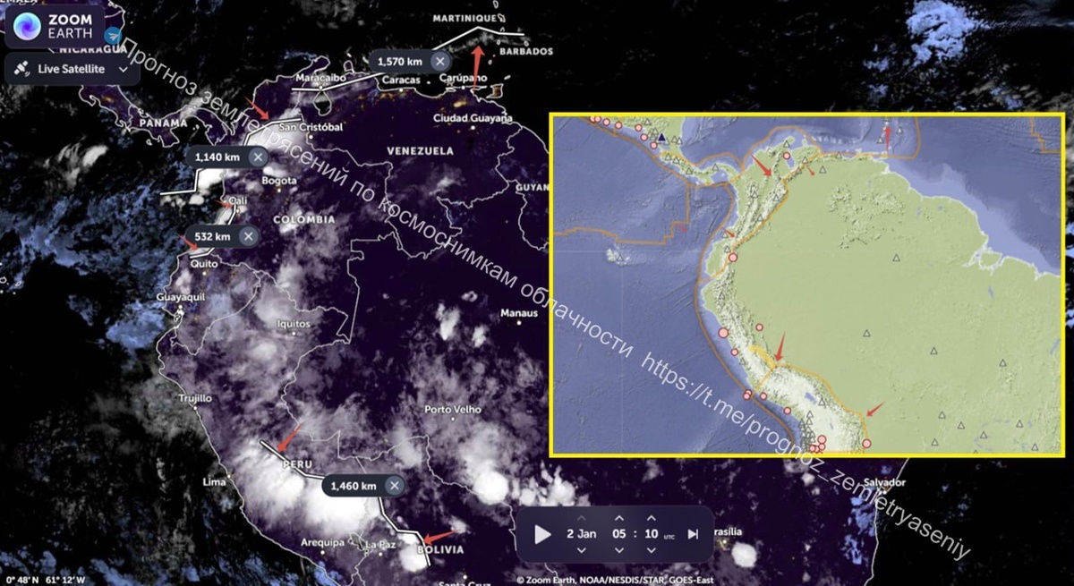 Сохраняется тектоническое напряжение и дегазация на севере Южной Америки (Панама, Колумбия, Венесуэла), а также затронута восточная граница плиты Альтиплано. По обеим зонам есть вероятность землетрясения М6-7 до 11 января ======= Tectonic stress and degassing persist in the north of South America (Panama, Colombia, Venezuela), and the eastern boundary of the Altiplano plate is also affected. There is a possibility of an M6-7 earthquake in both zones before January 11.